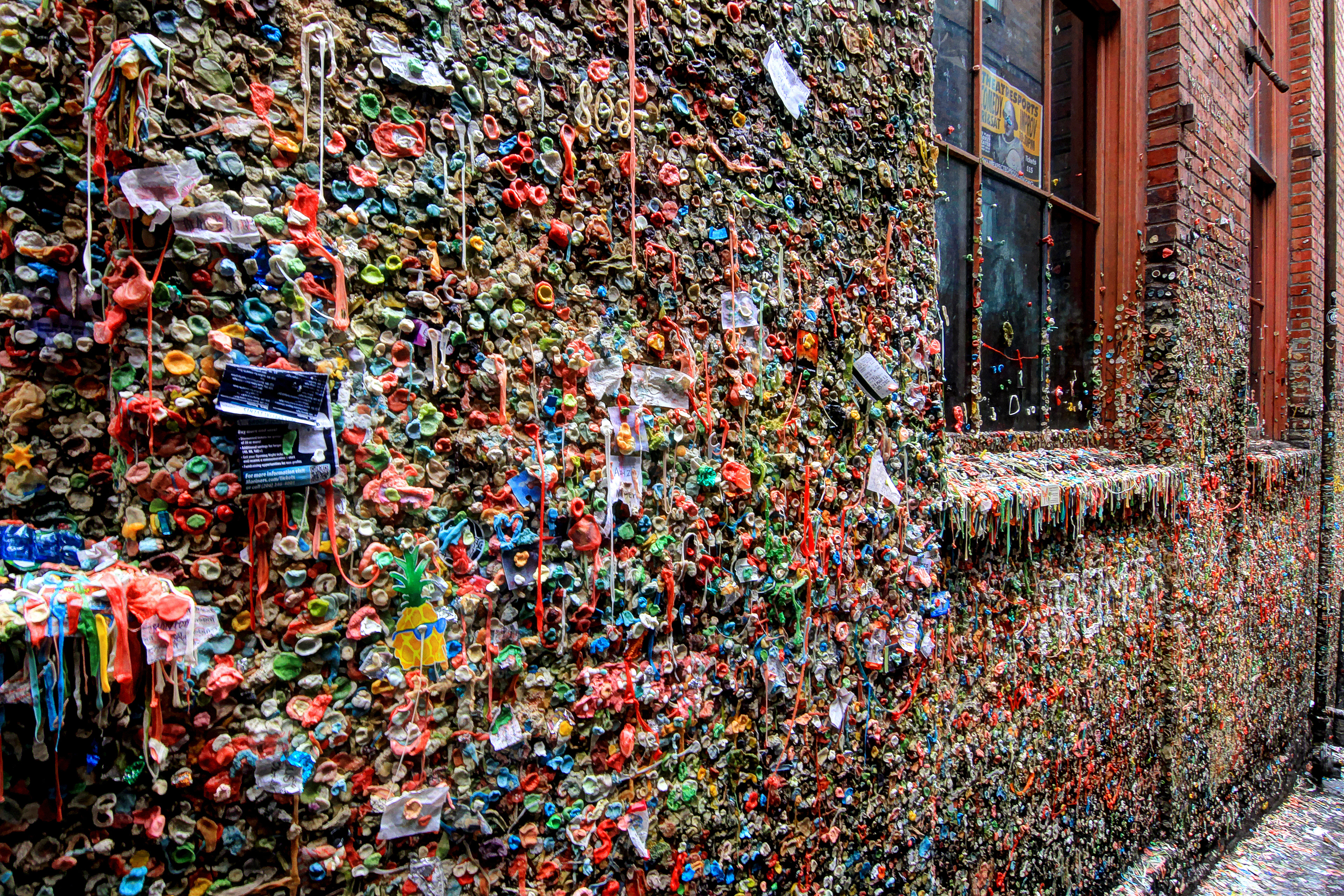 The renowned wall of gum found at Pike Place Market in Seattle, Washington