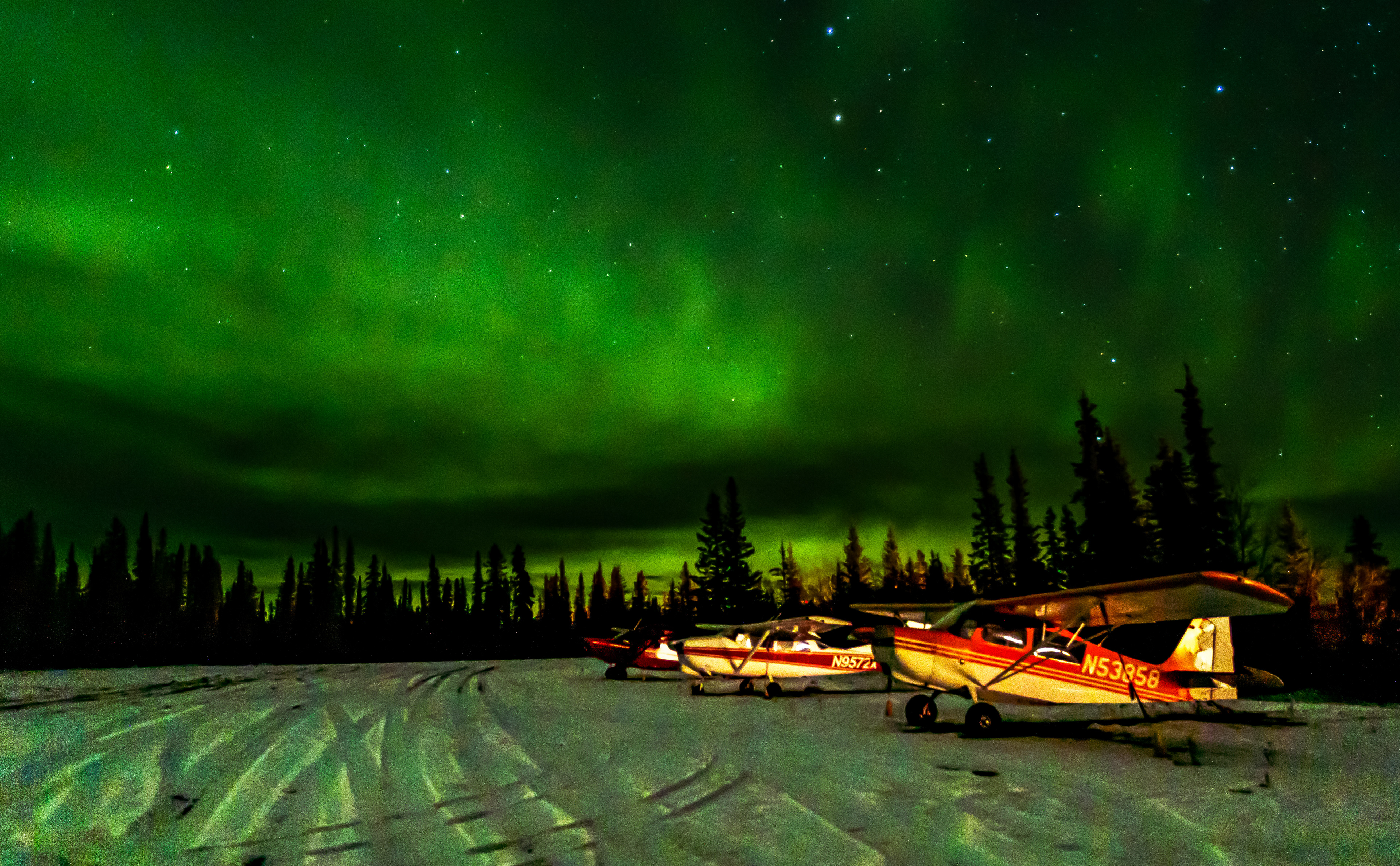 The northern light dances through cloudy skies over an airstrip in Talkeetna, Alaska.