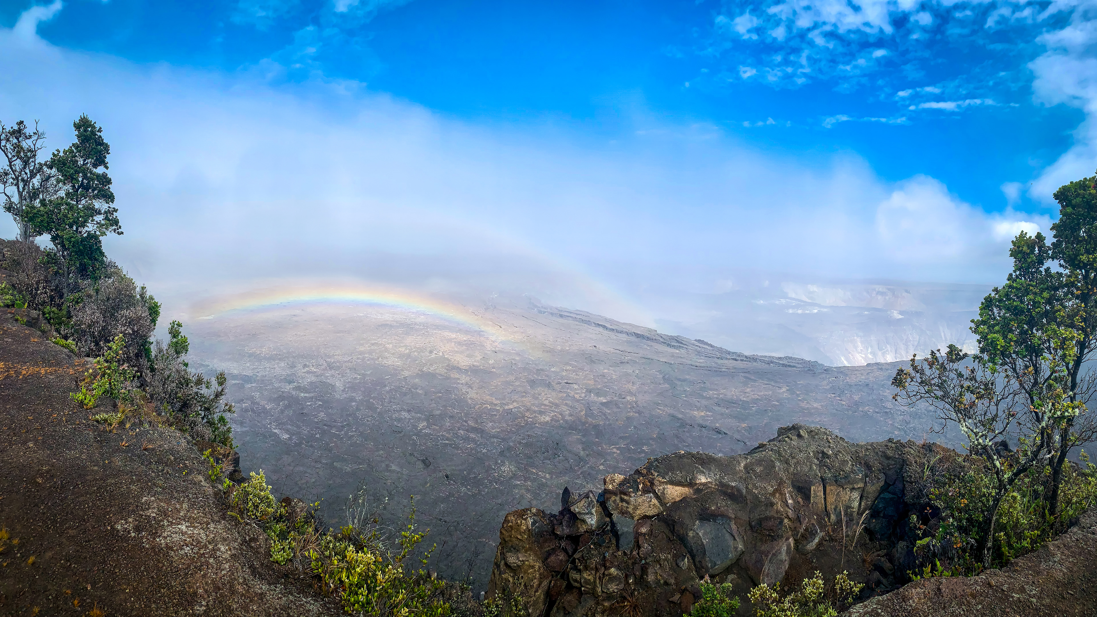 A double rainbow appears just outside the foggy caldera of Kilauea in Hawaii