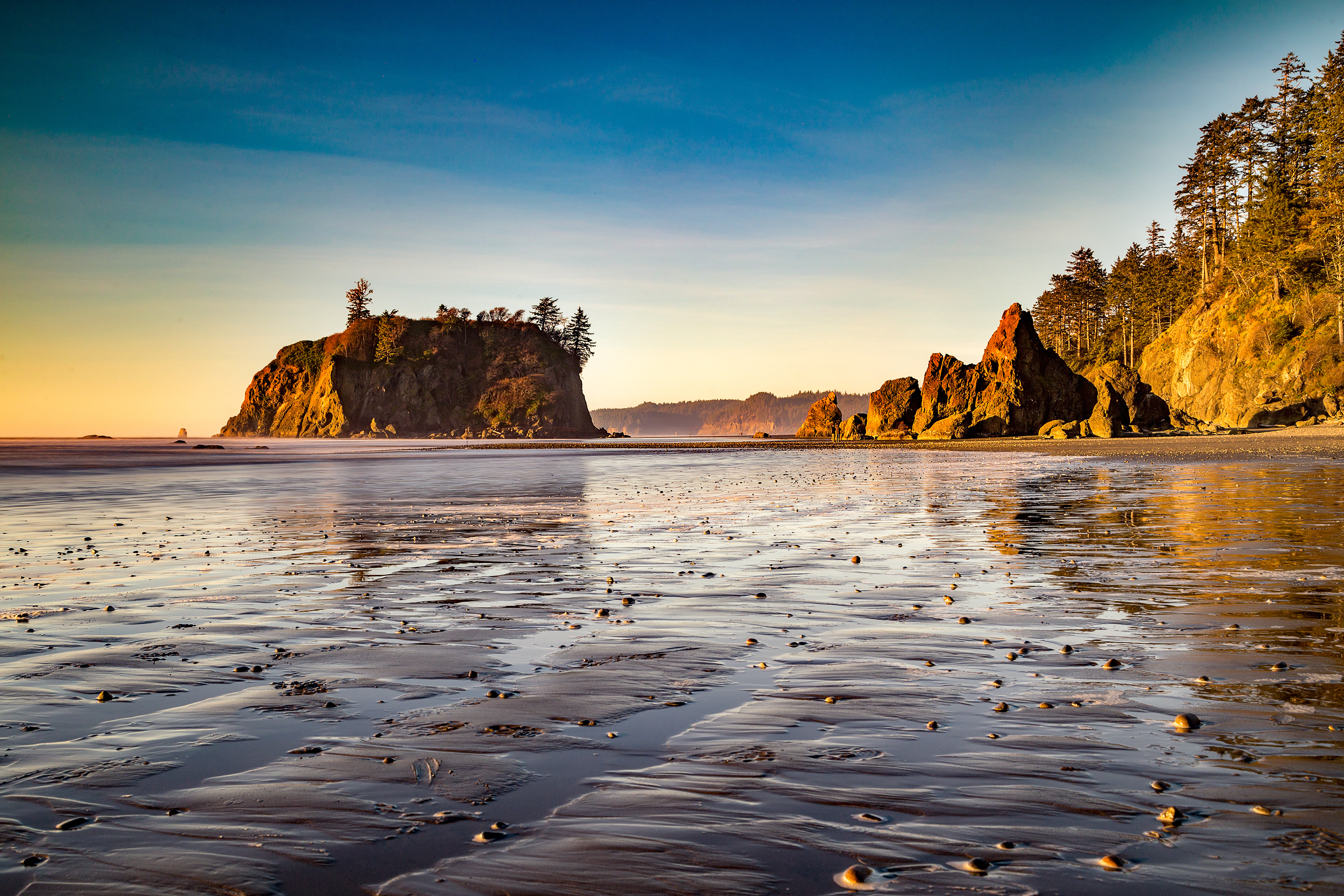 The low tide creates a spectacular reflection of the rock formations on the Olympic Coast.