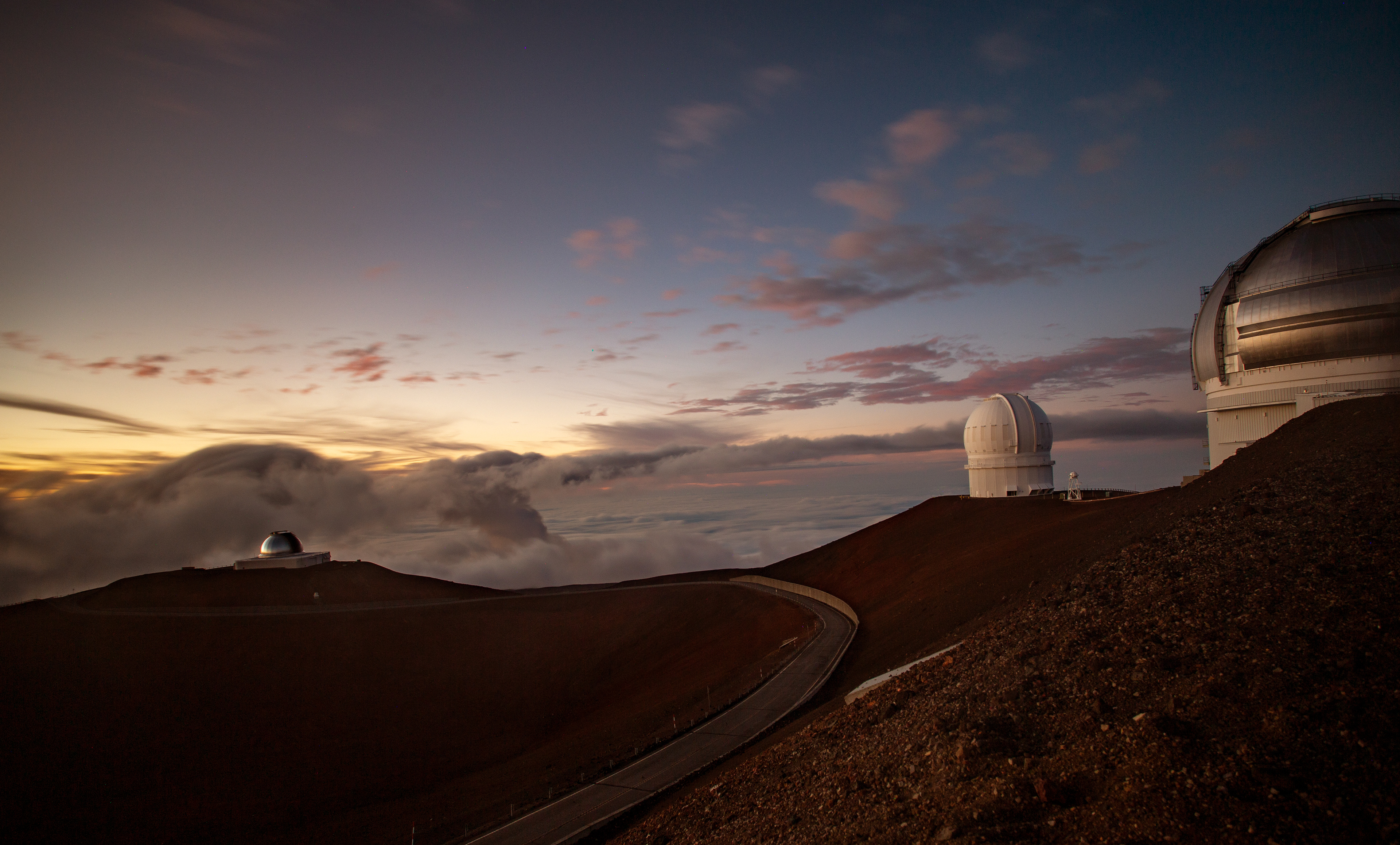 The sun sets on the radio telescopes atop the summit of Mauna Kea Volcano on the Island of Hawaii