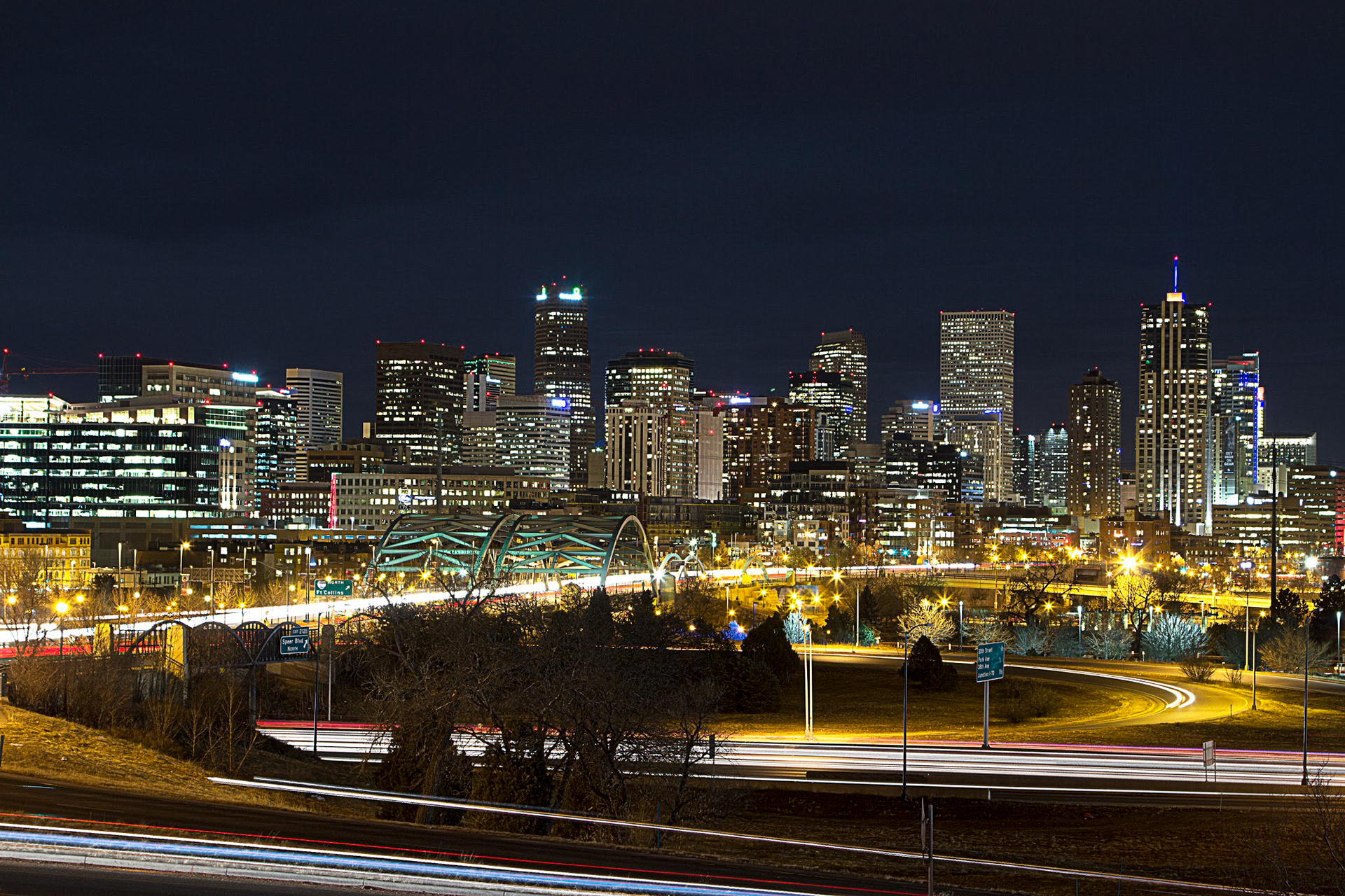 Streaks of vehicular lights zoom along the interstate north of the Denver city skyline.