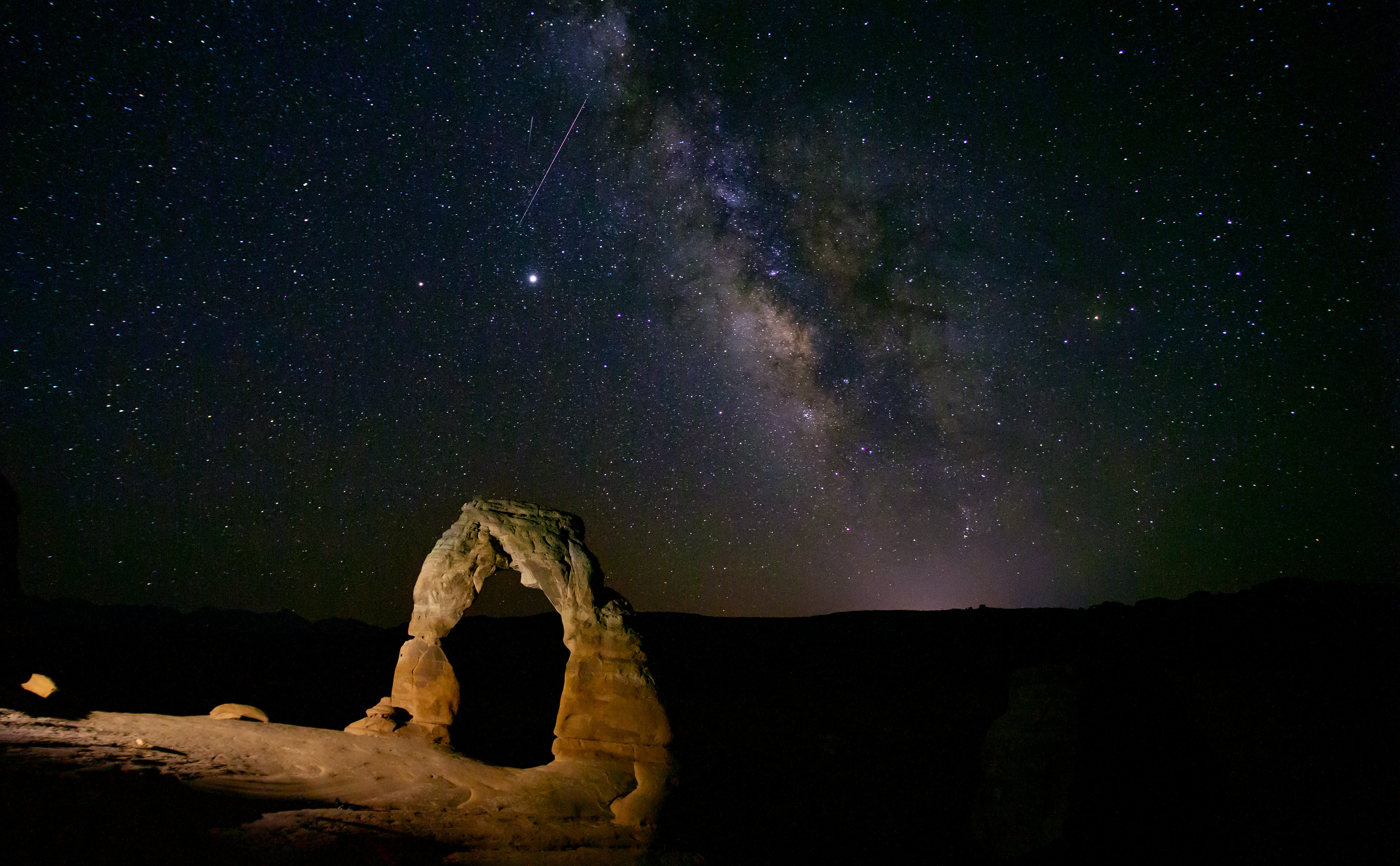 Perseid Meteors streak across the night sky as the Milky Way shines over Delicate Arch in Arches National Park