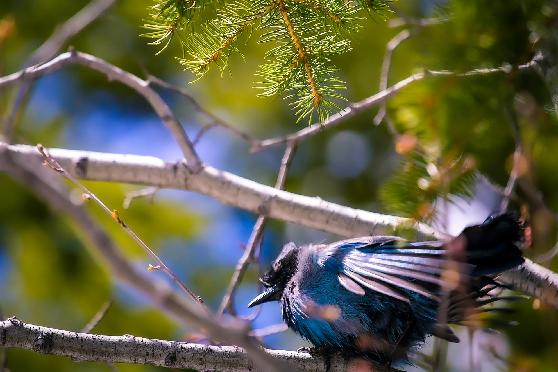 A steller's jay shakes its feathers while perched on a tree in Rocky Mountain National Park