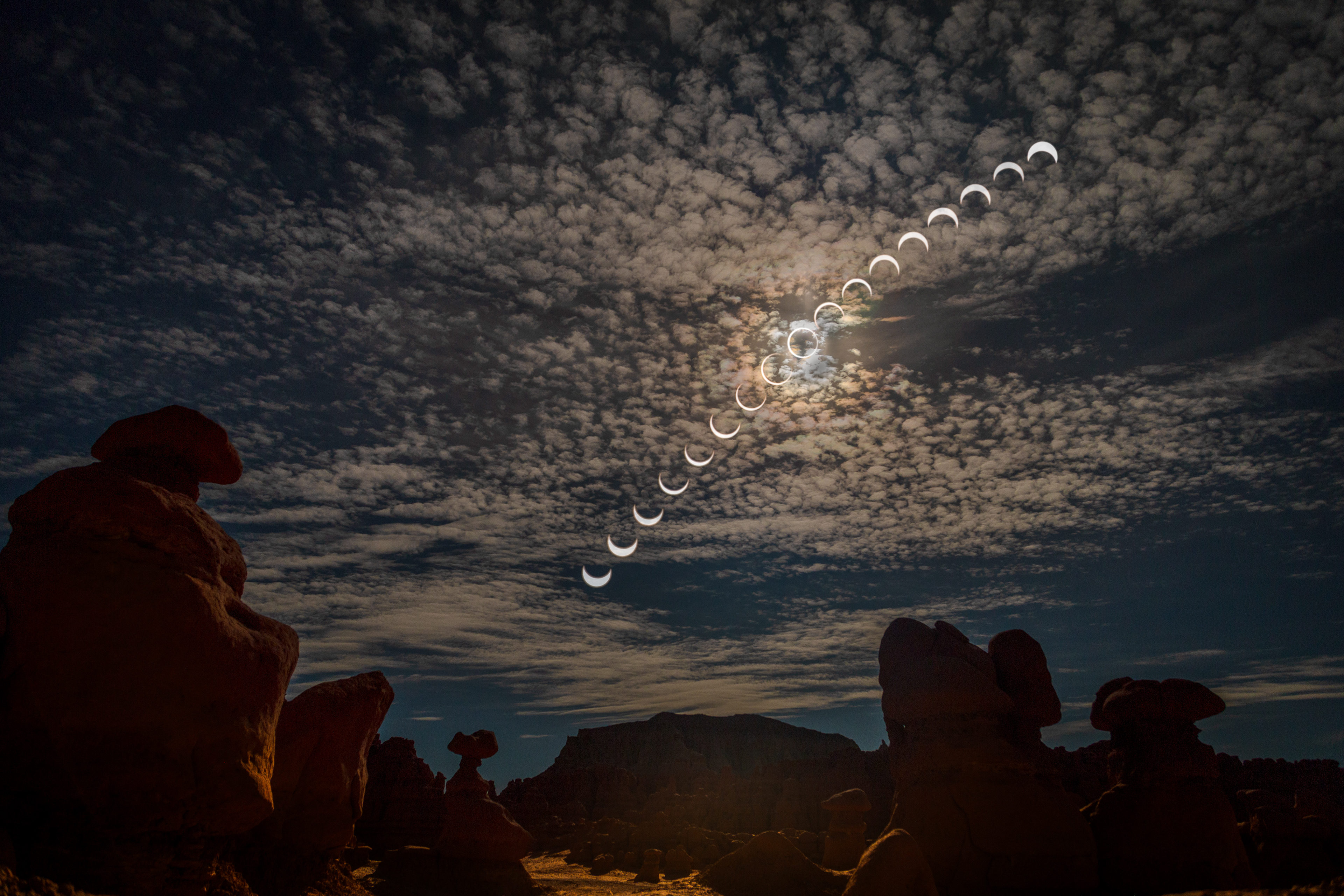 A composite time-lapse image of the annular eclipse over Goblin Valley State Park on October 2023
