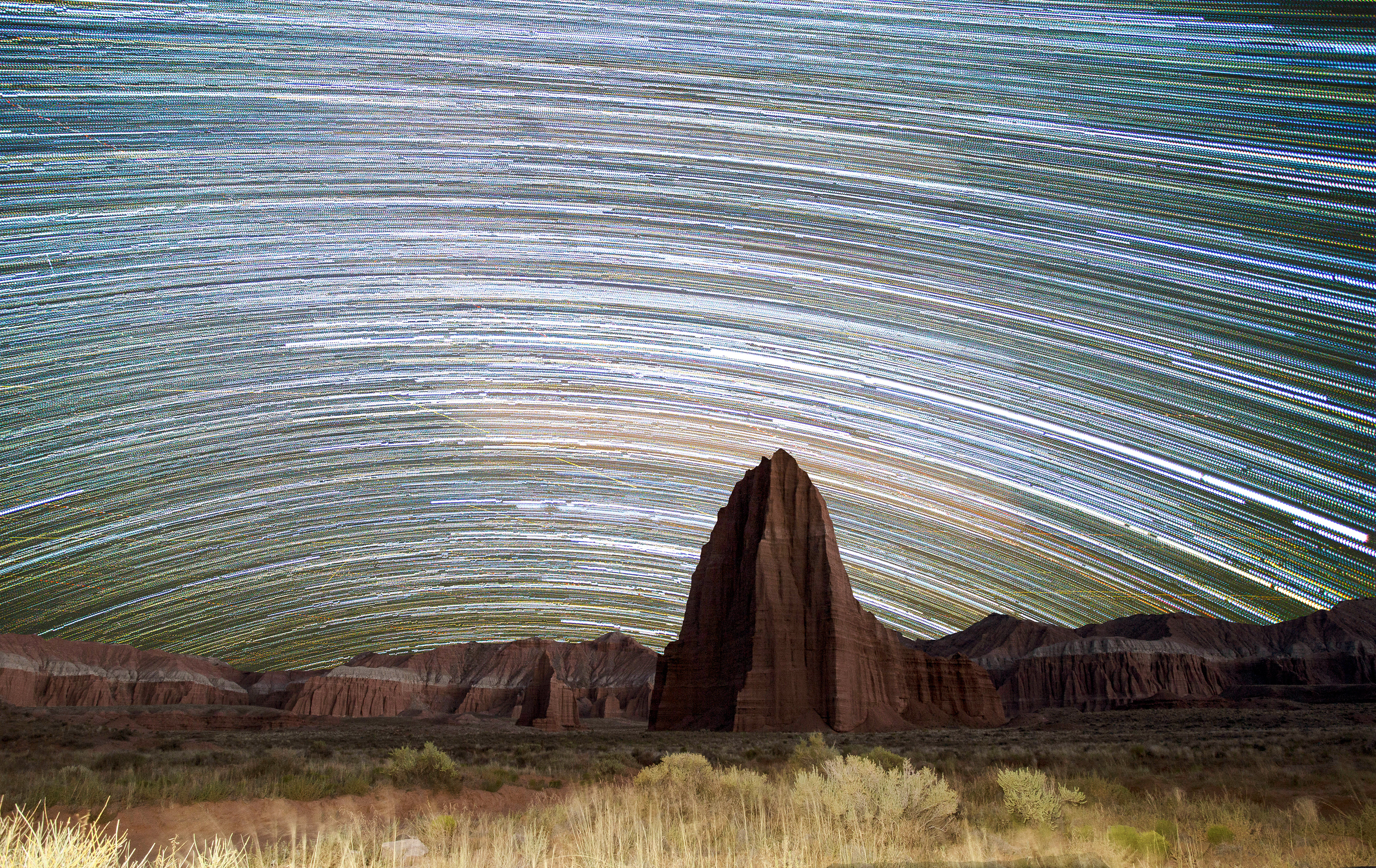 A stacked time-lapse of the stars over The Temple of the Sun and Moon in Capitol Reef National Park