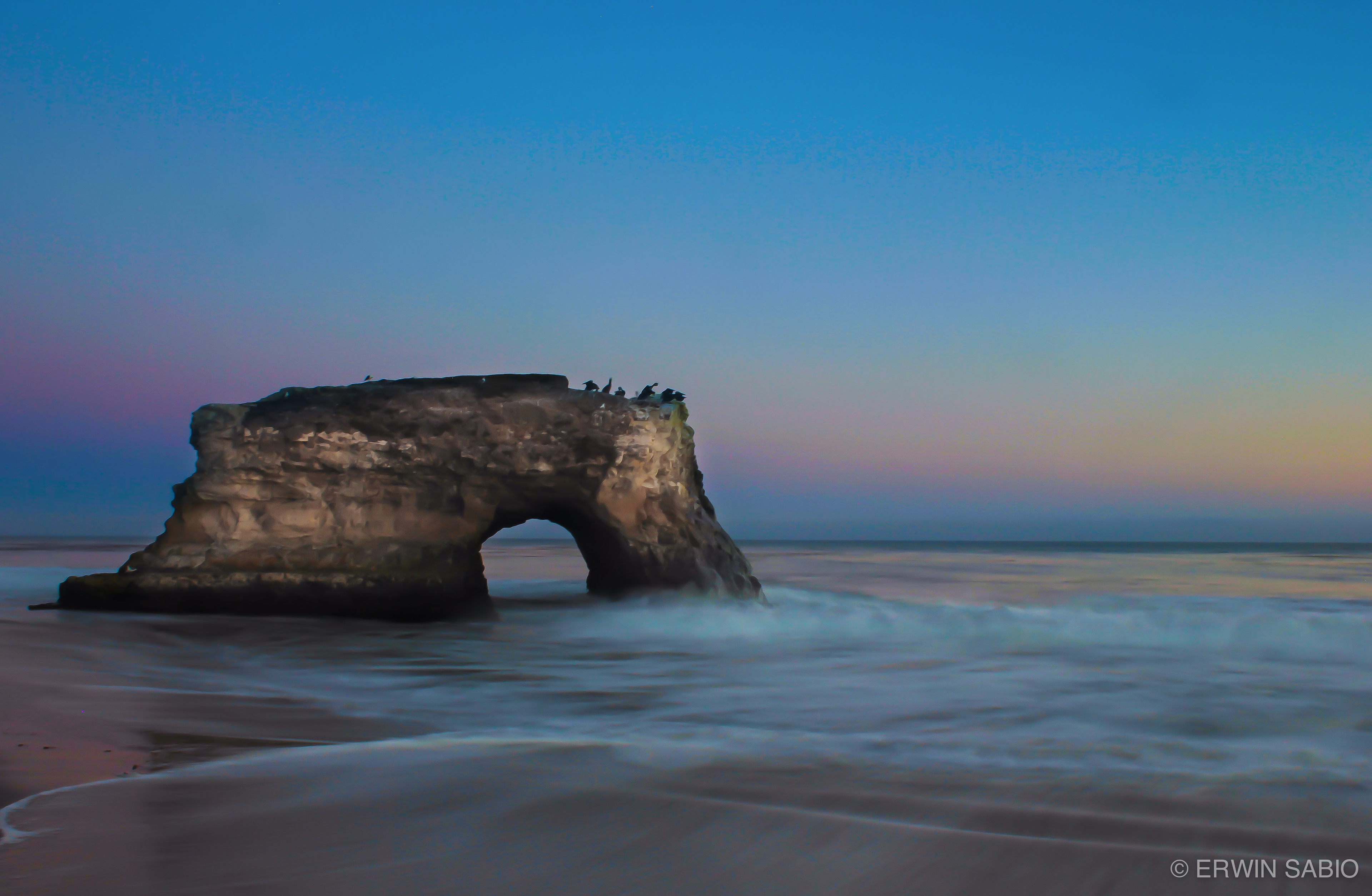 Different shades of blue surround the natural bridge in Natural Bridges State Park in Santa Cruz, CA at twilight.