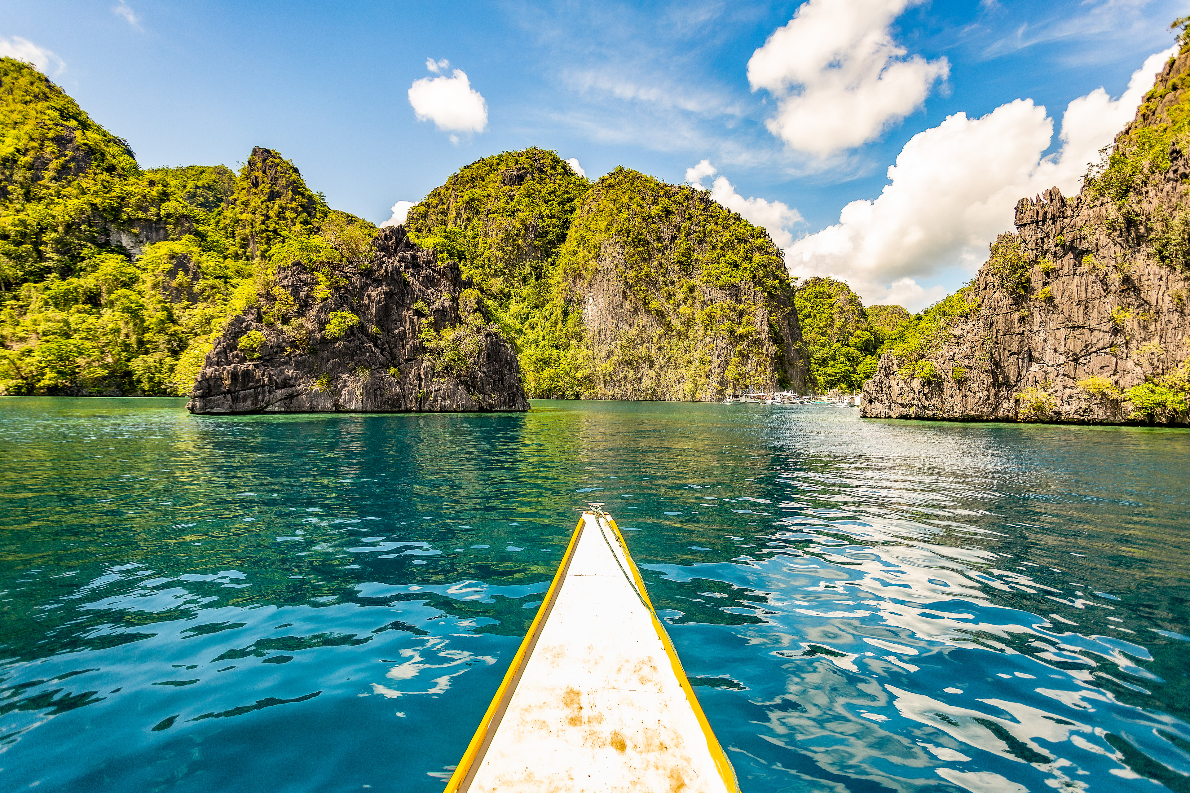 The bow of a small outrigger boat heads to the islands of Palawan Province in the Philippines,